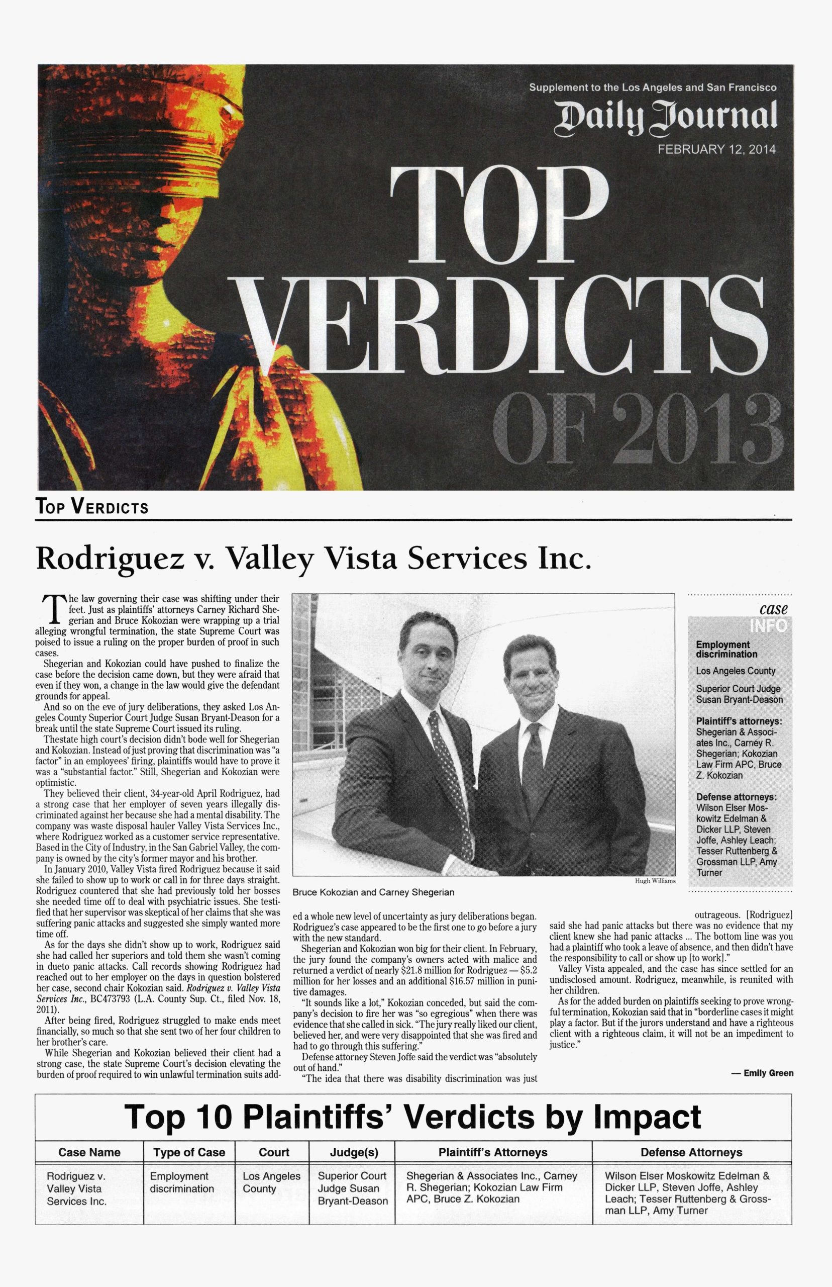 Recently, Kokozian Law Firm, APC, was able to achieve one of the highest verdicts in favor of an individual employee Plaintiff in the history of Southern California. In the case of April Rodriguez v. Valley Vista Services, Inc. et. Al., (2013), Plaintiff April Rodriguez was wrongfully terminated and discriminated against (among other causes of action) on the basis of her mental disability of panic attacks. Her trial was held between January and February 2013, and in February a jury verdict in excess of $21.7 million was reached in her favor.